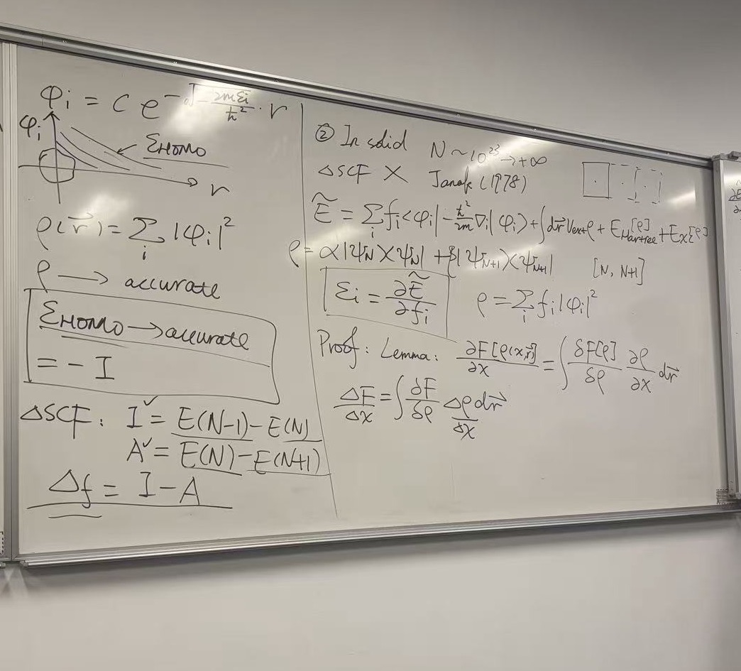 - Result: Because the “jump” (derivative discontinuity) is zero, the predicted band gap is just the Kohn-Sham gap (\(\Delta_{KS}\)), which we proved in the previous board is significantly smaller than the true fundamental gap. This is why standard DFT underestimates band gaps.