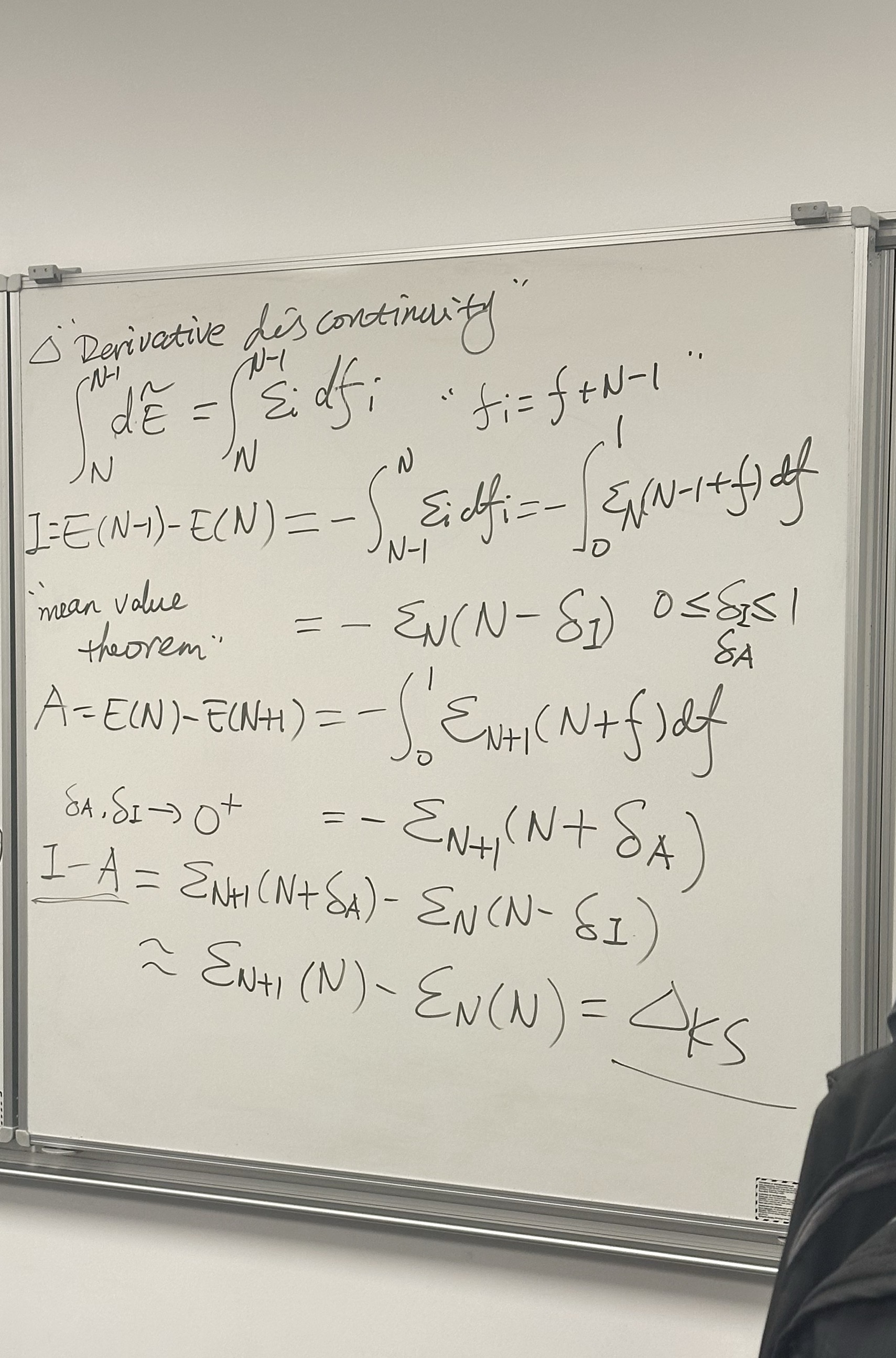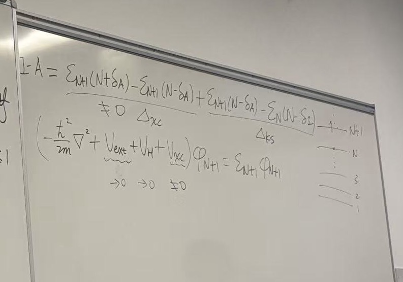 - The Fundamental Gap (\(I - A\)): \[I - A = \mathcal{E}_{N+1}(N+\delta) - \mathcal{E}_{N}(N-\delta)\] (Note: The handwriting for the specific subscripts here is a bit quick, but it generally describes the difference in energy derivatives as \(\delta \to 0^+\), known as \(\Delta_{KS}\) or the Kohn-Sham gap correction).
