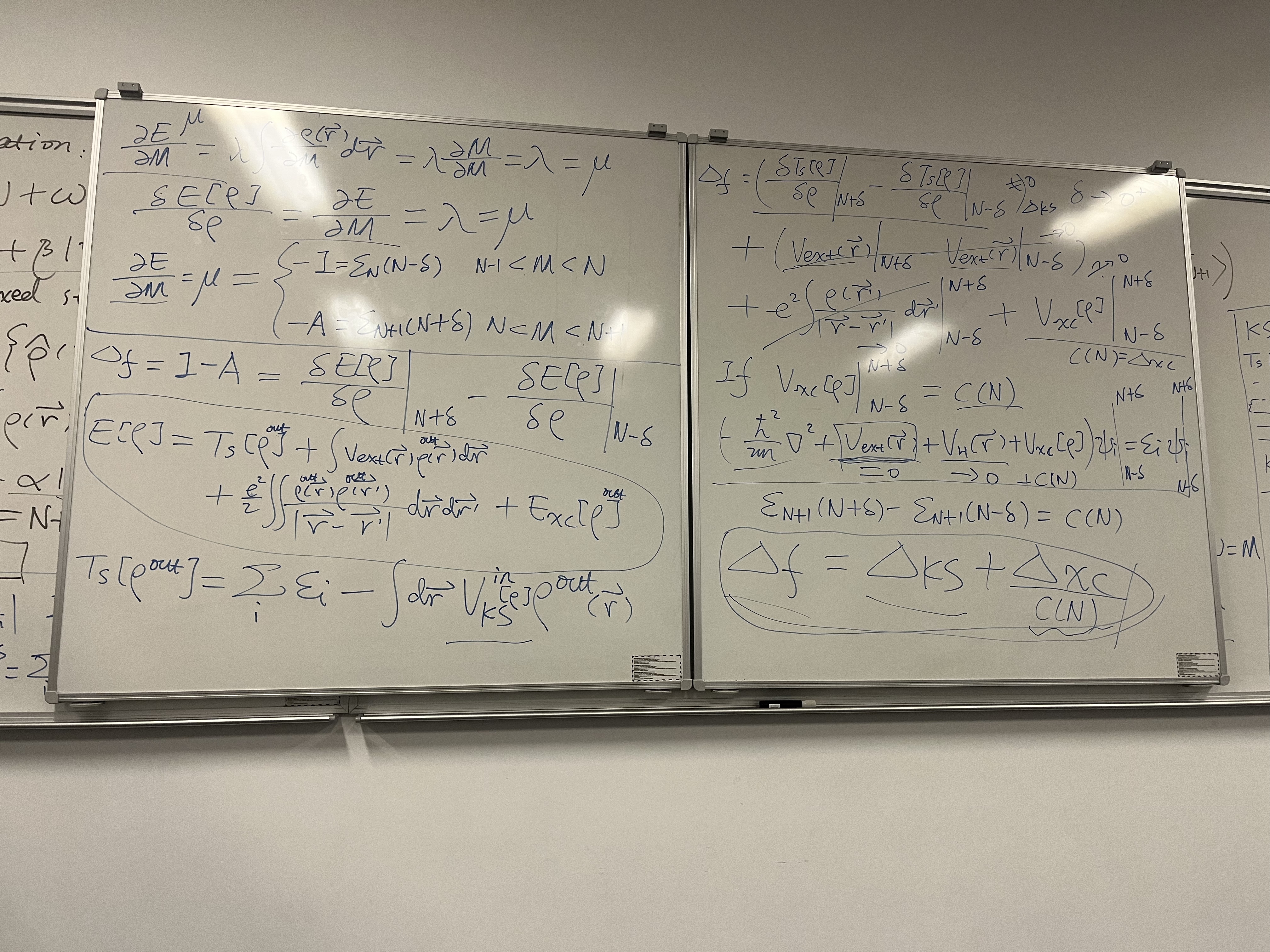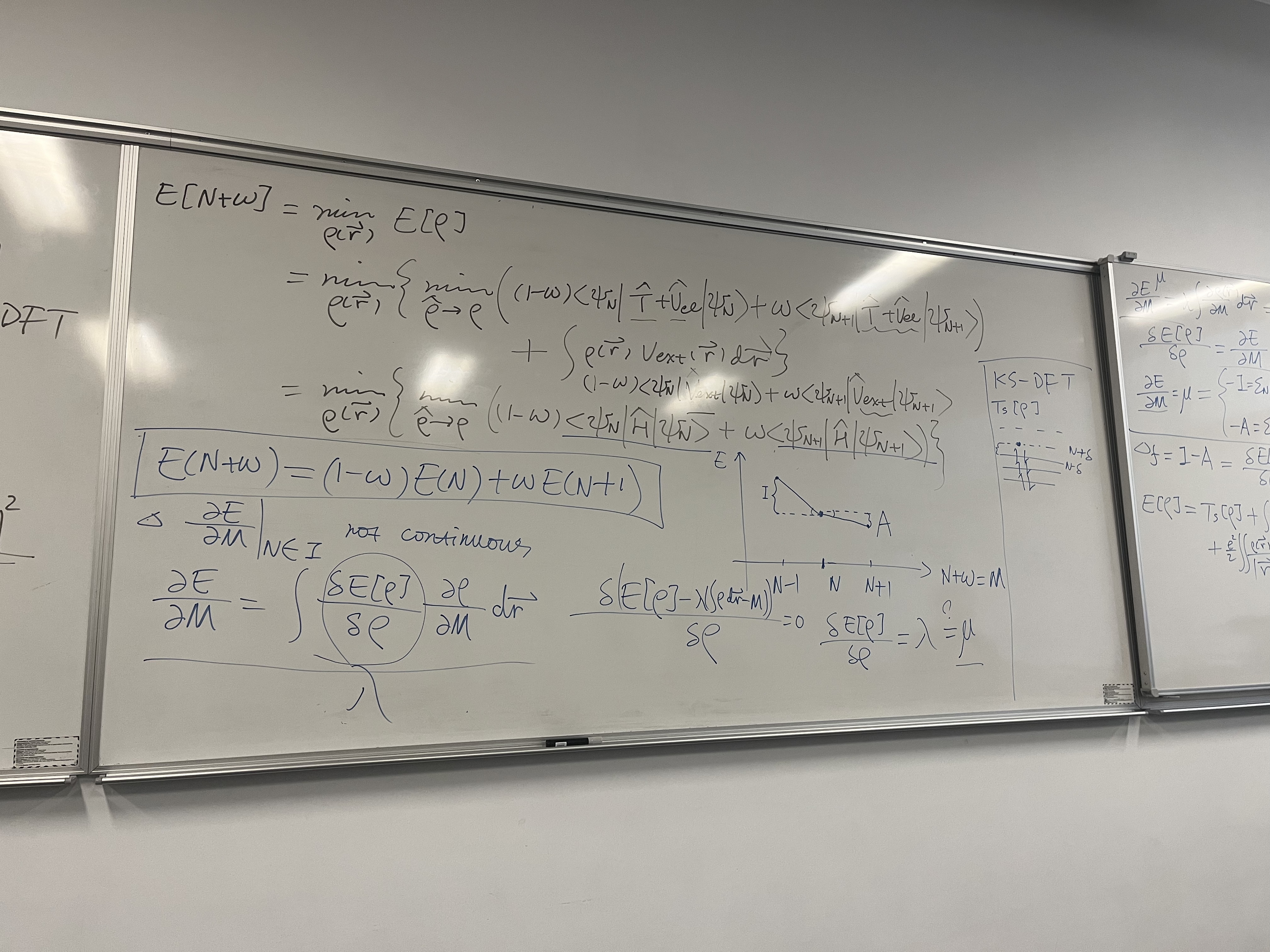 Total Energy Expansion: To find what causes this jump, the board writes out the standard Kohn-Sham total energy functional: \[E[\rho] = T_s[\rho] + \int V_{ext}\rho \, d\vec{r} + \frac{e^2}{2} \iint \frac{\rho \rho'}{|\vec{r}-\vec{r}'|} \, d\vec{r}d\vec{r}' + E_{xc}[\rho]\]